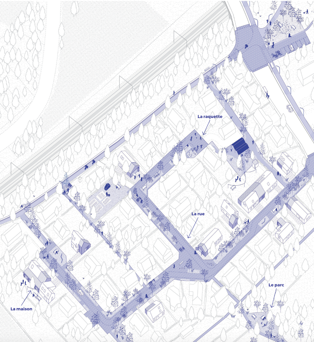 D’un parcellaire entièrement privatisé, dépendant d’une infrastructure pesante et peu efficiente, nous explorons les possibilités de reconfigurer ces quartiers vers plus de mise en commun. Ces pistes sont ouvertes, et nous revendiquons ici que la description est nécessaire et suffisante à la discussion. Ce travail de représentation et l’exposition qui a eu lieu ont pour ambition d’éveiller les imaginaires par le projet. Grâce au dessin, à la cartographie, on donne à voir une forme de systématisation d’espaces, d’initiatives, de projets, qui existent déjà sur le terrain, sous des formes plus éparses, comme autant de laboratoires qui vont dans le sens des transitions souhaitées. Mettre en lumière le déjà-là, raisonner sur sa capacité à devenir structurel, permet de s’en saisir comme d’un levier pour aller plus loin. Forger une crédibilité à cet imaginaire a donc été la première étape de la recherche ; l’objectif était de révéler des opportunités, montrer des possibilités sans chercher à être ni conclusif ni dogmatique.