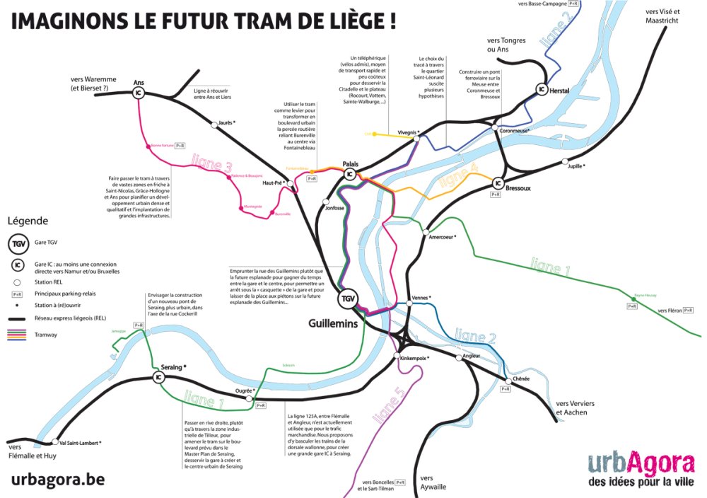 2011. La diversification thématique se poursuit, avec une première mobilisation sur un enjeu patrimonial — le Palais des fêtes de Coronmeuse —, plusieurs interventions autour du site de la Chartreuse (conférence de presse, brochure, organisation de visites du site,...) ou contre les centres commerciaux en périphérie de la ville (notamment l’extension du CORA). À Seraing, l’association tente d’obtenir la réservation de l’espace nécessaire à l’aménagement futur d’un site propre de transport en commun sur le futur boulevard urbain, en vain. La proposition de créer une nouvelle ligne ferroviaire, entre Liège et Mons via Ottignies et Nivelles, la Transurbaine, reçoit un accueil très favorable, notamment dans le Brabant wallon. Fin d’année, publication d’une étude qui démontre la faisabilité d’un Réseau express ferroviaire et propose un schéma (qui est quasiment celui qui s’impose aujourd’hui) tandis que le bras de fer sur le tram est total, avec le cabinet Henry.