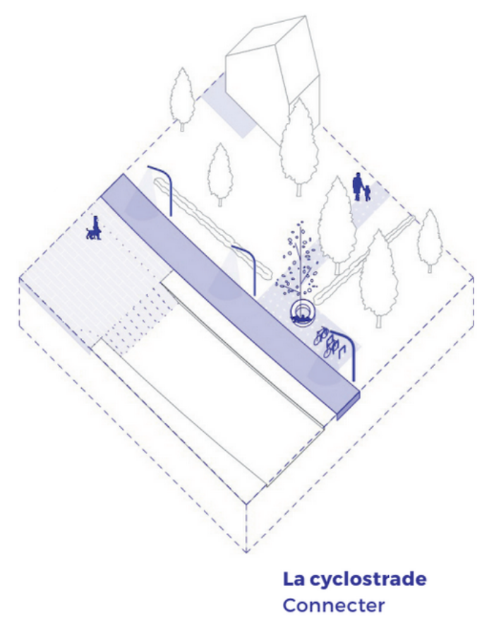 12h30. Jérémie aperçoit Yaëlle rentrer au bout de l’allée commune. Depuis cette rentrée scolaire, elle va à pied ou à vélo à l’école * quel bonheur de ne plus devoir faire les trajets ! Il y a un tracé pedibus, qui profite du réseau de sentiers qui a été reconstruit ces dernières années. Il permet de relier les cul-de-sac et passe entre les clos et les jardins. D’un coup, les maisons de ses ami·e·s qui semblaient si loin sont tout près, au fond du jardin ou de l’autre côté de la haie. C’est dingue. Puis les adultes eux aussi circulent beaucoup plus à pied maintenant. Fini la voiture pour aller au Delitraiteur ou n’importe où. La perception des distances a changé.
