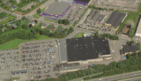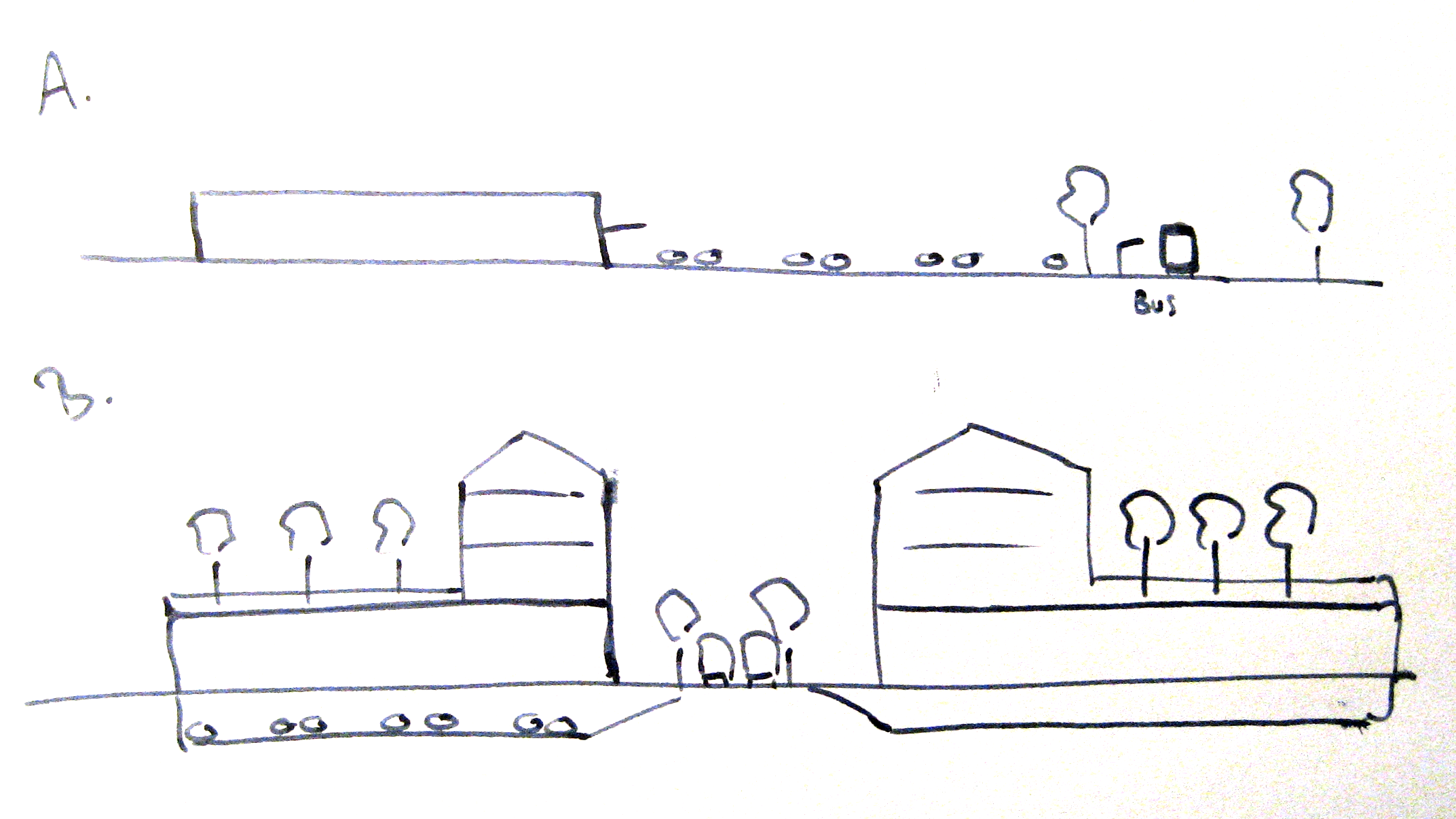 Il faut retrouver des formes architecturales et urbaines favorisant la mitoyenneté, la construction d’étages au-dessus des (toutes ces toitures vides pourraient accueillir du logement, des jardins,), la densité qui n’exclut par, bien au contraire, le dégagement de surfaces significatives pour la réalisation d’espaces verts qui soient autre chose que des espaces douteusement décoratifs entre un parking et une autoroute comme sur les exemples ci-dessus. Bref, remplacer A par B (figure 5) : sur l’espace occupé par une seule grande surface et son parking, on peut désormais en placer deux grandes, mais aussi du logement ou du bureau dans les étages, des jardins sur les toitures. L’entrée des magasins est désormais à rue, favorisant les piétons et les cyclistes. L’arrêt de bus qui se trouvait jusqu’à alors fort éloigné de l’entrée du magasin peut désormais se trouver à sa portée immédiate : la qualité du service, donc la fréquentation, donc la fréquence s’en ressentent positivement. Le parking — dont la surface nécessaire, grâce à la diversification modale, diminue ou stagne malgré l’augmentation de la densité — se voit localisé en sous-sol.