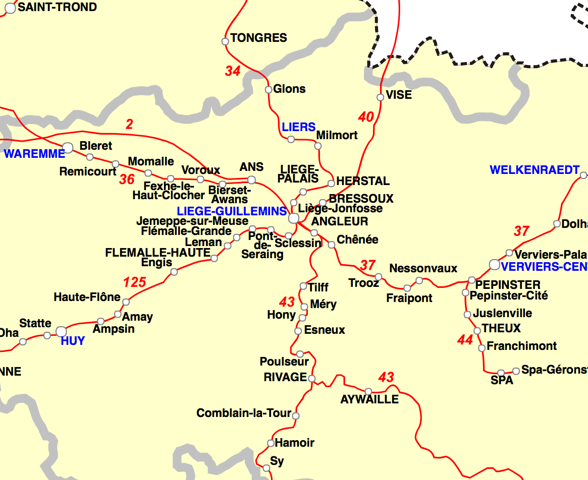 Commençons par situer Liège et la gare des Guillemins, au croisement de deux principaux axes. Le premier relie Bruxelles et l’Allemagne ; il représente environ 50% du trafic ferroviaire. Le second est la dorsale wallonne, à quoi on peut ajouter une ligne allant vers le Luxembourg, une vers Marche, une vers Visé et Maastricht et enfin une vers le Limbourg.