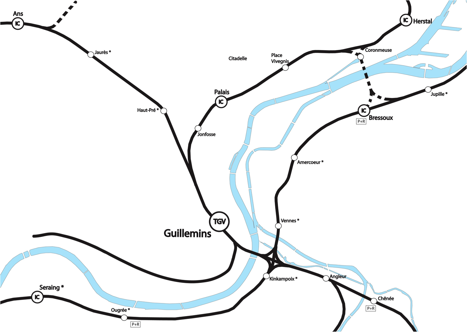 Si je zoome un peu voici le réseau liégeois tel qu’il se présente, presque, aujourd’hui. En pointillé, ce sont deux lignes en débat. Le centre-ville se trouve à 2-3 km au nord de la gare de Guillemins.