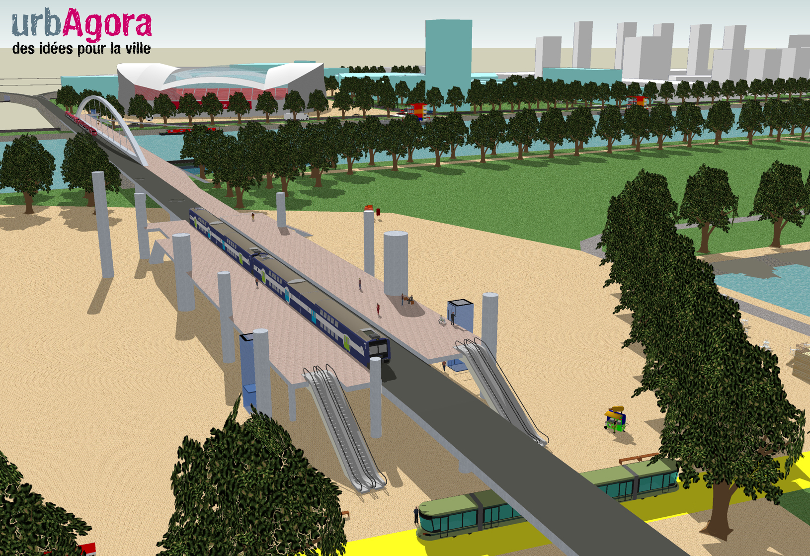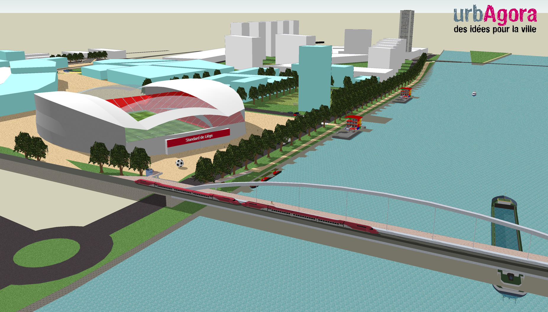 C’est la connexion ferroviaire entre les deux rives (voir notre conférence de presse du 24 juillet pour les explications) qui constitue l’épine dorsale de ce projet. Le pont dont nous proposons la construction pour franchir la Meuse se voit flanqué d’une large passerelle cyclo-pédestre. Une station ferroviaire — directement connectée au tram — est crée, sur pilotis, à hauteur du Palais des Sports. L’implantation exacte de cette liaison pourrait être revue pour minimiser l’impact sur le remarquable front bâti de la place Coronmeuse et augmenter les rayons de courbure du chemin de fer.