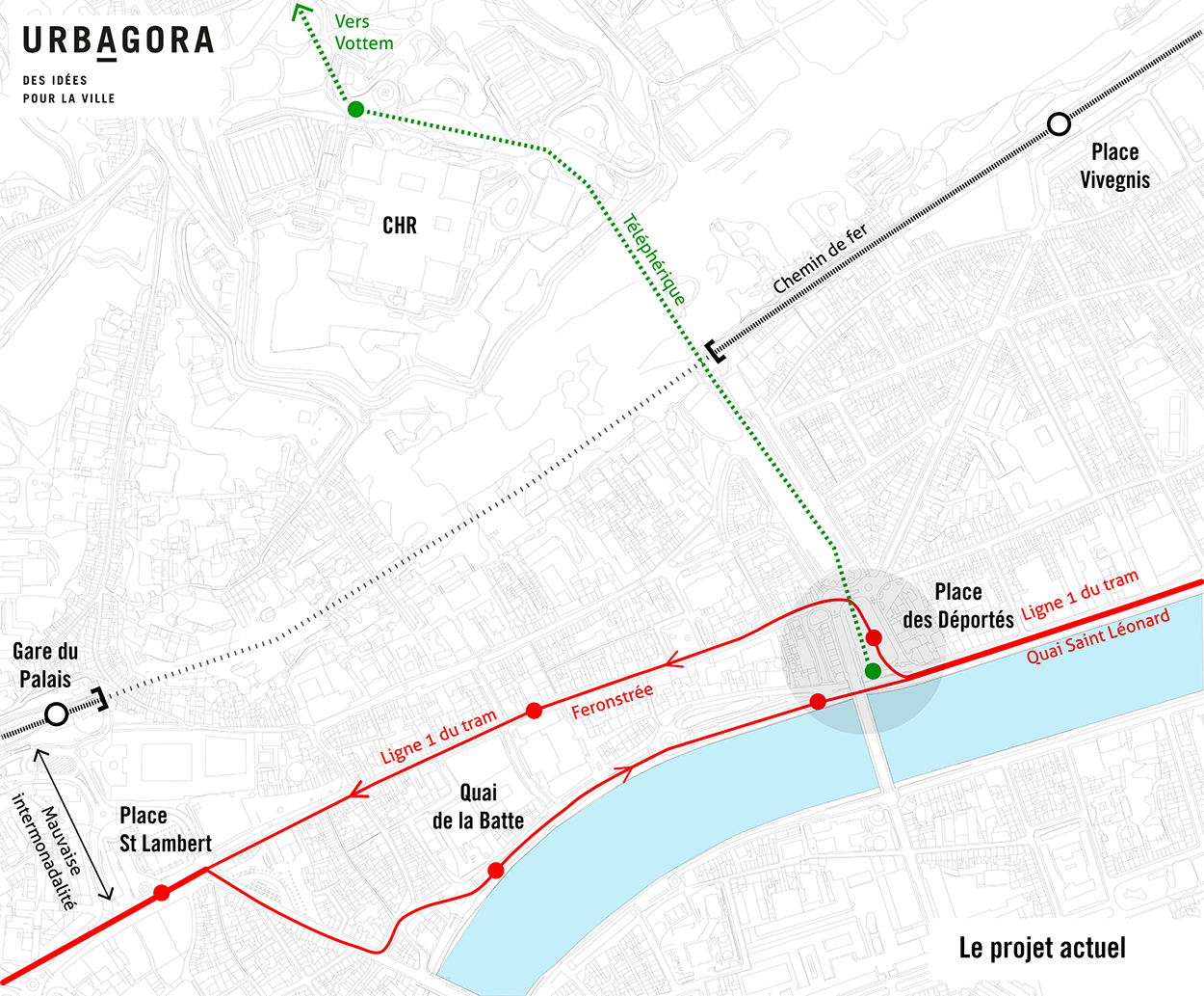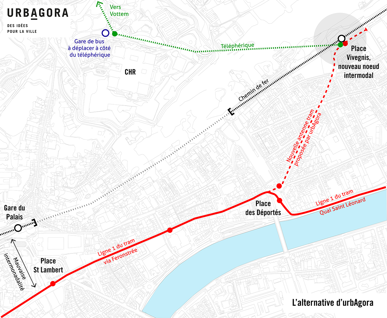 En particulier, nous continuons à penser que le site de la place Vivegnis est le lieu le plus indiqué pour organiser l’intermodalité entre le téléphérique, le train et le tram — intermodalité sans laquelle le projet de téléphérique perdra une grande partie de son intérêt.