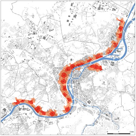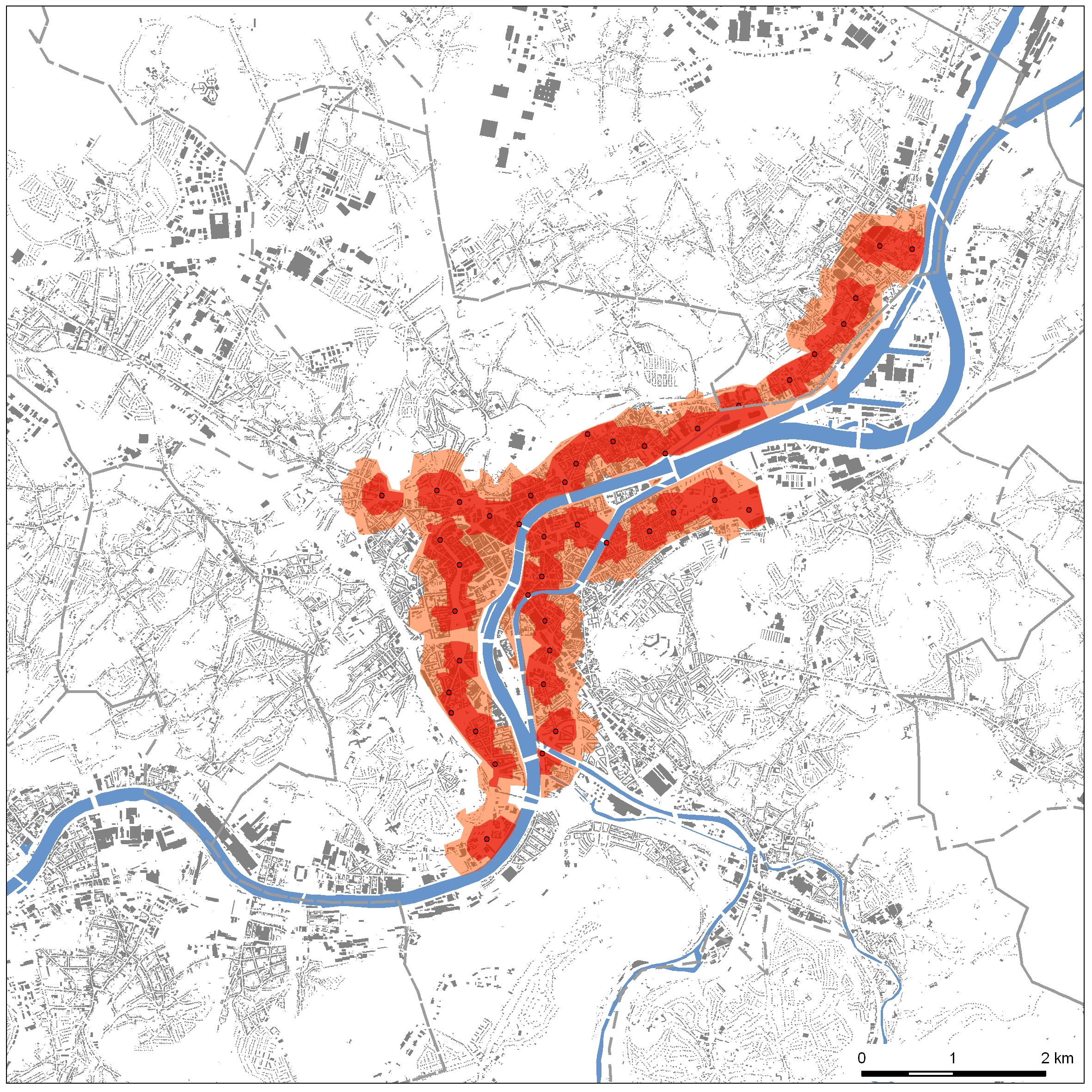Ajoutons encore que le comparatif proposé ici ne porte que sur deux options. Un travail plus systématique permettrait de comparer de nombreuses sous-variantes (notamment au niveau de la localisation des arrêts) et de produire une proposition de tracé optimisée sous l’angle du nombre de m2 bâtis desservis, par exemple |12|. Il est donc très vraisemblable que, à kilométrage constant, l’on peut faire encore mieux que le projet proposé par urbAgora.