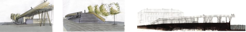 Sur le coté habité de la place, sera déposé un petit pavillon provisoire. Ce lieu, pouvant être un simple container, se voudra être « une boîte à idée ». Une structure légère devra permettre d’accéder à son toit, duquel on pourra apprécier la transformation de l’environnement d’un regard. Ce sera l’occasion de suivre le chantier mais aussi d’observer l’évolution progressive de l’espace public et de la vie qui s’y développe. Enfin, de ce promontoire, on devrait également pouvoir retrouver un premier rapport visuel avec la Meuse.