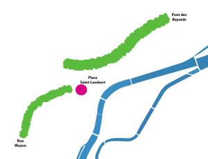 Restent donc les quais et surtout l’axe de la Nationale 3, reliant le Cadran à Saint-Pholien via la rue de Bruxelles, la place Saint-Lambert, la rue Léopold, le Pont des Arches. Mais même cet axe majeur et historique du transit à travers la ville devra changer de fonction le jour où s’implantera la seconde ligne de tram, la rue Léopold étant trop étroite pour faire autrement, comme nous l’avons signalé plus haut.