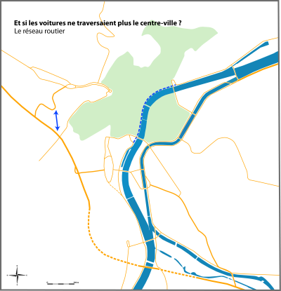 Suppression du trafic traversant ne signifie cependant pas suppression de l’accès au centre-ville. Au contraire, nous pensons pouvoir démontrer que les gains engendrés par la suppression du trafic de transit seront, dans l’ensemble, bénéficiaires à la facilité d’accès au centre-ville ainsi qu’à son attractivité, notamment en augmentant significativement les performances du réseau de bus (qui, de fait, sera moins englué dans le trafic), en rendant plus agréable et plus sûr l’usage du vélo, en requalifiant les espaces publics pour d’autres usages.