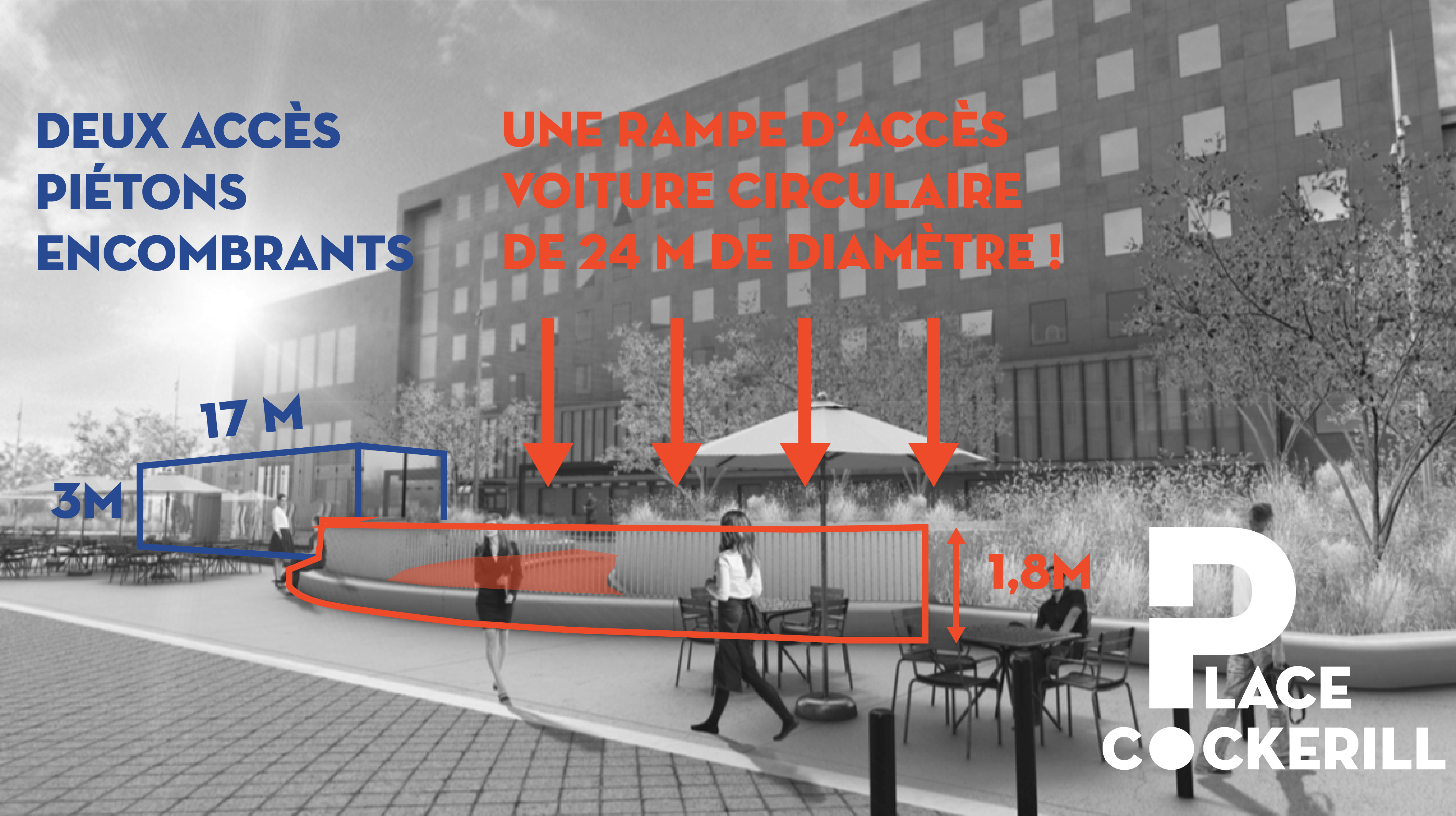- Le choix de doubler les accès à ce parking, qui a amené à placer une rampe d’accès aussi intempestive que dispensable au milieu de la place. Ce choix n’est semble-t-il dicté que par un seul motif : la nécessité d’étendre provisoirement la Batte vers l’amont, le temps des travaux du tram — c’est-à-dire la conséquence du choix extrêmement litigieux de faire passer le tram par les quais alors qu’il était possible de le faire passer en double sens par Feronstrée (ce qui aurait notamment permis une prolongation du tram vers la place Vivegnis et vers le futur téléphérique ou vers Outremeuse via le Pont Maghin, options qui sont purement et simplement rendues impossibles par le tracé retenu). Autrement dit, le sacrifice de la place Cockerill apparaît comme une conséquence nuisible supplémentaire des mauvais choix posés dans le dossier du tram. Une fois de plus, nous vous appelons donc à opter pour un passage du tram en double voie par Feronstrée.