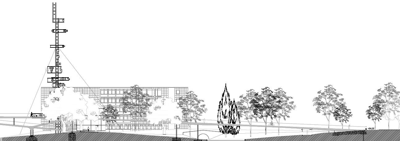 Les connections cyclables et piétonnes nous apparaissent opportunes. La longue traversée du parc par la rampe PMR — quand bien même il s’agit d’un site classé, rappelons que la qualité du parc tient aussi, au-delà de son dessin originel, à son caractère évolutif tout au long du XXe siècle (construction du pavillon des Sports nautiques pour l’Exposition internationale de 1930, restauration du parc au lendemain de seconde guerre, suppression de Jardin d’Acclimatation et construction du Palais des Congès et de la tour cybernétique à la fin des années ’50, implantation du RAVeL et de la plaine de jeux dans les années ’90) — nous apparait apporter plus d’avantages que d’inconvénients, en facilitant la liaison cyclo-pédestre entre les quartiers du Longdoz et la rive gauche de la Meuse. La qualité de son insertion paysagère dans le parc tient à la simplicité de son dessin, l’ondulation de son parcours (illustration 4) et à la réduction du nombre d’appuis au niveau du sol (réduits à deux, voir illustration 5). Néanmoins, comme cela a été évoqué en séance publique d’information à l’ICADI, il serait souhaitable de réaliser des aires de repos planes pour les PMR.