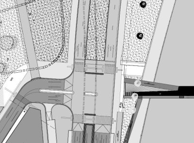 1) Nous proposons d’inverser la position de la traversée cyclable du passage-piétons projeté (voir illustration 1), de telle manière à l’inscrire dans la prolongation de la rampe d’accès de la passerelle (celle qui comporte une pente de 10 %) ;